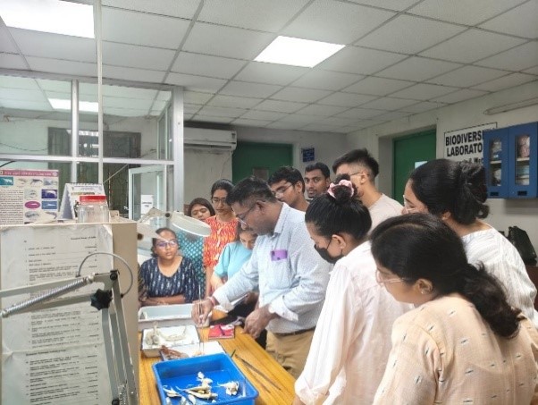 The training course curriculum covered taxonomy of finfishes and shellfishes, including clupeids, cyprinids, catfishes, snakeheads, and commercially important prawns, supplemented with hands-on practical sessions. Participants were also trained in biodiversity assessment techniques using various diversity indices and advanced software tools such as PRIMER, R, PAST, and the Aquatic Species Invasiveness Screening Kit (AS-ISK). Additionally, the course incorporated modules on habitat assessment, focusing on river habitat characterization and application of the fish-based Index of Biotic Integrity (IBI).