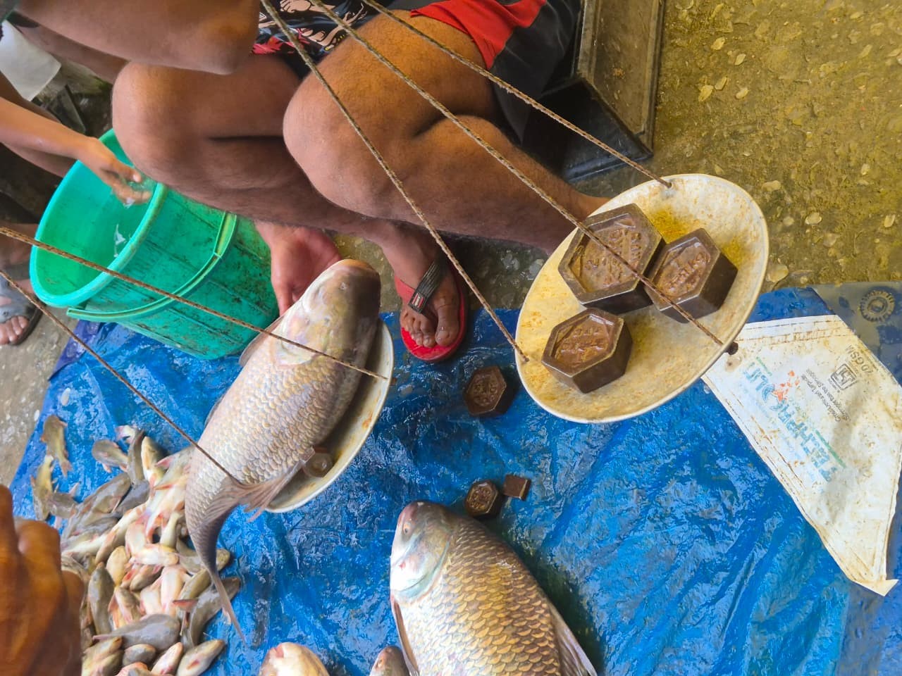 The survey recorded over 48 finfish species, in addition prawns and crabs, highlighting the rich diversity of this river stretch. Notable taxa included Clupisoma garua, Indian Major Carps (IMCs) such as Labeo catla, Labeo rohita, Cirrhinus mrigala, and Labeo calbasu, along with various other catfishes like Rita rita, Mystus spp., Wallago attu, and Sperata spp. Additionally, clupeids such as Gudusia chapra, freshwater prawns (Macrobrachium spp.), and several small indigenous fish species, including Amblypharyngodon mola and Puntius spp., were recorded. Numerous juvenile carps and catfishes were noted, signifying active reproduction during the season.