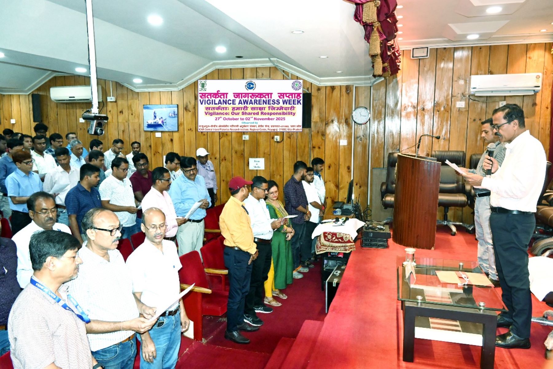 The event began with Dr. D.K. Meena, Senior Scientist and Vigilance Officer, introducing the significance and outlining the planned activities for the week. Dr. Meena invited Dr. B.K. Das, Director of the Institute, to administer the Integrity Pledge and encouraged all staff members to participate. The pledge ceremony saw engagement from 144 staff members, including contractual staff and research scholars, with several also completing the e-pledge. Throughout the campus, banners, posters, and placards highlighted the importance of vigilance, transparency, and integrity, reflecting CIFRI's commitment to maintaining high ethical standards in research and administration