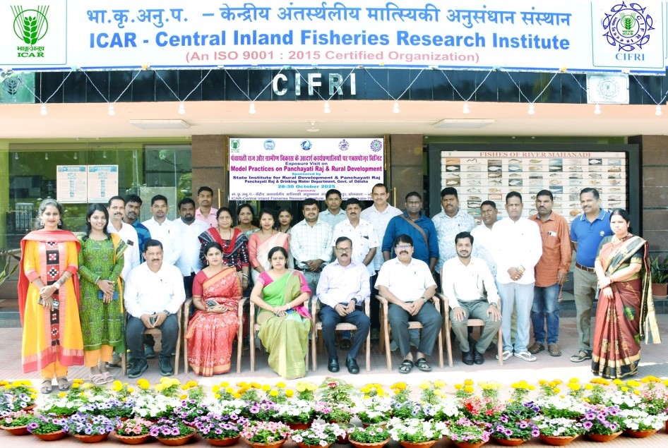 The main objective of this visit was to provide the visitors a first hand knowledge as well as showcasing few best practices in the areas of Rural Development and Panchayati Raj of West Bengal. The Programme was inaugurated by Dr. B. K. Das, Director of ICAR-CIFRI with his formal welcome address and then he discussed with them about the origin and research activities of CIFRI. He also elaborated about the importance of inland fisheries sector in promoting the livelihood security of the fish farmers, fishers and fish-entrepreneurs as well as the nutritional security of the people. The visiting representatives of PRIs of Odisha also interacted with scientists of the institute and gained a preliminary knowledge about the research facilities available in the institute. The team visited 3 Gram Panchayats of Basanti, South 24 Parganas of West Bengal namely Joygopalpur, Jyotishpur and Jharkhali. The visit was really an effective learning experience for them as these areas fall under the world heritage site of Sunderban of West Bengal and moreover, they interacted with the representatives of those GPs and discussed with them about various means and methods they are following for the ground water recharge, control the plastic pollution as well as the water pollution, sanitation of the rural people, employment generation and livelihood security of the rural population under the respective GP etc.