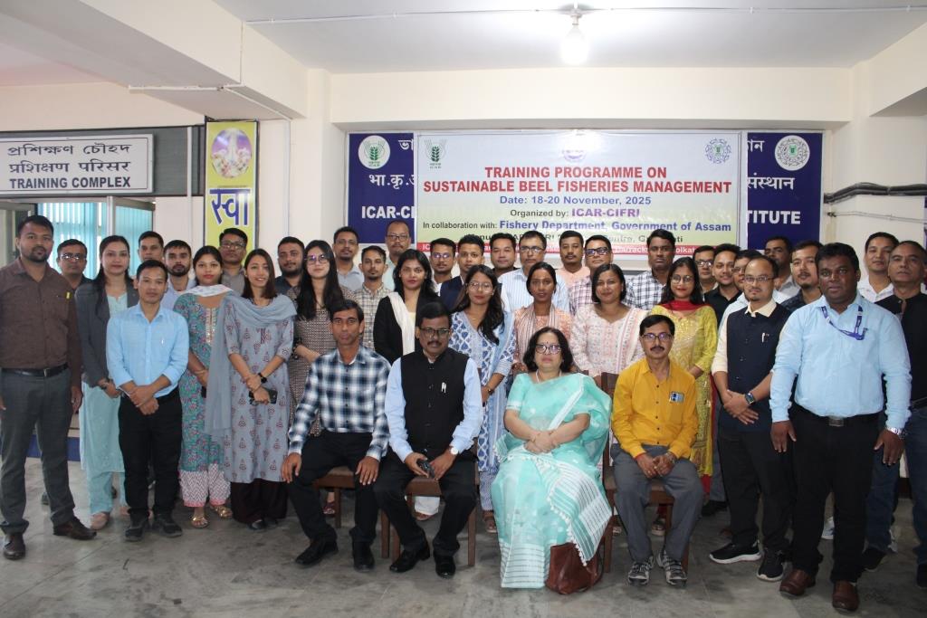 During the 3-days training programme, emphasis was given on sound and holistic management of beel fisheries. Important topics like management protocols for beel fisheries, macrophyte control, fish disease management, environment monitoring, fish seed rearing, community based fisheries management, engineering aspects, fish in human nutrition were covered. The valedictory session of the training programme was held on 20th November, 2025. In the valedictory session Dr. Simanku Borah, Scientist and Coordinator of the training program presented a brief training report. Shri Gauri Sankar Das, ACS, Director of Fisheries, Assam was the chief guest in the valedictory session. He emphasized that there is scope for tremendous development in fisheries sector of the state and particularly in beel fisheries and all the officials should work cohesively and whole-heartedly. Fisheries officials of the state expressed their satisfaction on the training program.