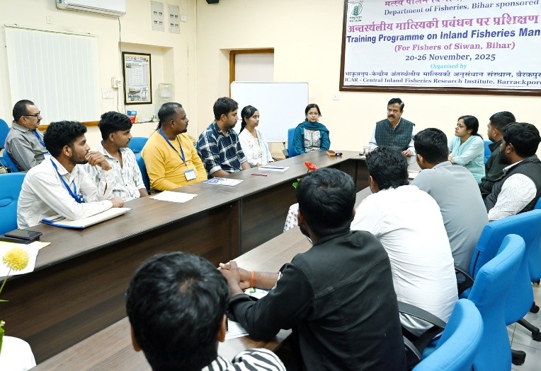A seven-day training programme on “Inland Fisheries Management” was successfully conducted for 30 fish farmers from Siwan, Bihar, from January 20 to November 26, 2025, under the sponsorship of the State Fisheries Department. The programme was organised under the overall guidance of Dr. B. K. Das, Director, ICAR–Central Inland Fisheries Research Institute (ICAR-CIFRI), with the objective of strengthening the knowledge and skills of rural fish farmers and equipping them with best practices for sustainable and profitable fisheries management.