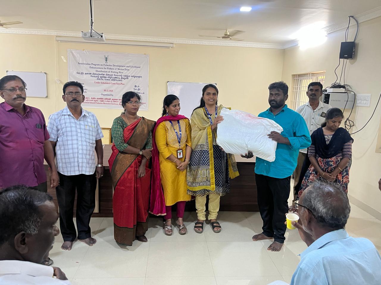 As part of the program, fishing nets were distributed to fifteen Scheduled Caste (SC) fishers, including three women beneficiaries. The program was attended by 50 fishers of Mettur Dam, Salem district. Dr. V. L. Ramya, Senior Scientist welcomed the gathering and highlighted the contributions of ICAR-CIFRI towards the enhancement and sustainable management of inland fisheries. Dr. Sibina Mol S., Scientist, spoke on the importance of responsible fisheries and conservation of fishery resources. Smt. Umakalaiselvi, Assistant Director, Department of Fisheries, Salem, Tamil Nadu outlined the various schemes available for fishermen.