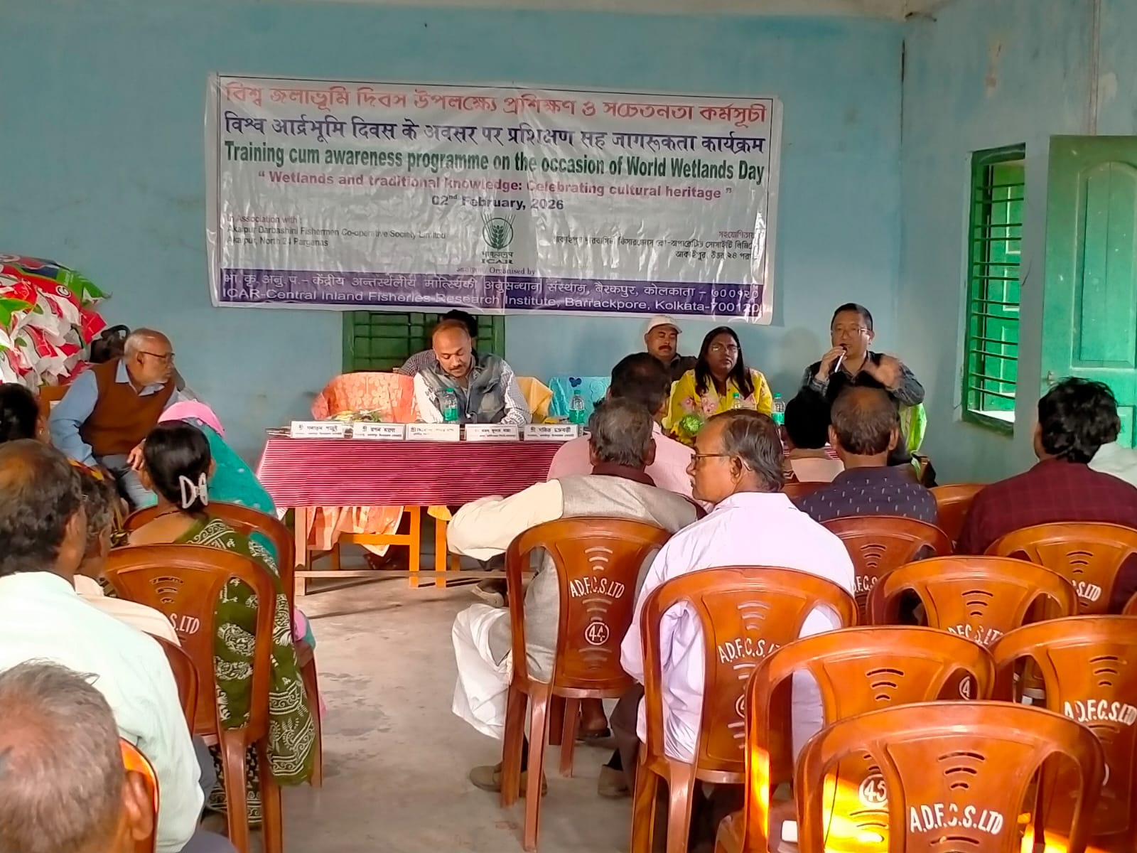 It is essential to put an effort to restore and conserve this vital ecosystem with participation of the stakeholders at ground level like fishers associated with the wetland. ICAR-Central Inland Fisheries Resources Institute conducted a training cum awareness programme with the theme of the year 2026 i.e. “Wetlands and Traditional Knowledge: Celebrating Cultural Heritage.” on the occasion of the World Wetland Day 2026 celebration on 2nd February 2026 at Akaipur beel, Nadia, West Bengal to extend training on sustainable management of wetland fisheries and sensitize the fishing community about conservation of wetland. The programme was held in association with the Akaipur Dwarbashini Fishermen’s Co-operative Society Limited, Akaipur, North 24 Parganas, West Bengal. During the programme, Dr. Ranjan K. Manna, Principal Scientist and Head, Reservoir and Wetland Division, ICAR-CIFRI, described different activities of ICAR-CIFRI in wetlands under the leadership of the director, Dr. Basanta K. Das. He also highlighted the importance and role of all different trophic levels of wetlands for different ecosystem services and emphasized the needs of important factors like river connectivity, aquatic macrophytes, etc for the conservation of precious biodiversity of wetlands and urged the fishers to actively participate for the conservation and restoration of wetland to ensure the long-term sustainability of fish production. Dr. Asit Kumar Bera, Principal Scientist discussed about different dimensions of recurrent fish disease associated mortality in wetlands including possible preventive measures. Mr. Sanatan Parui, Chairman, and Mr. Swapan Malo, Secretary of the Akaipur Dwarbashini Fishermen’s Co-operative Society Limited, discussed various issues and challenges especially anthropogenic pollution they face for managing wetland fisheries.
