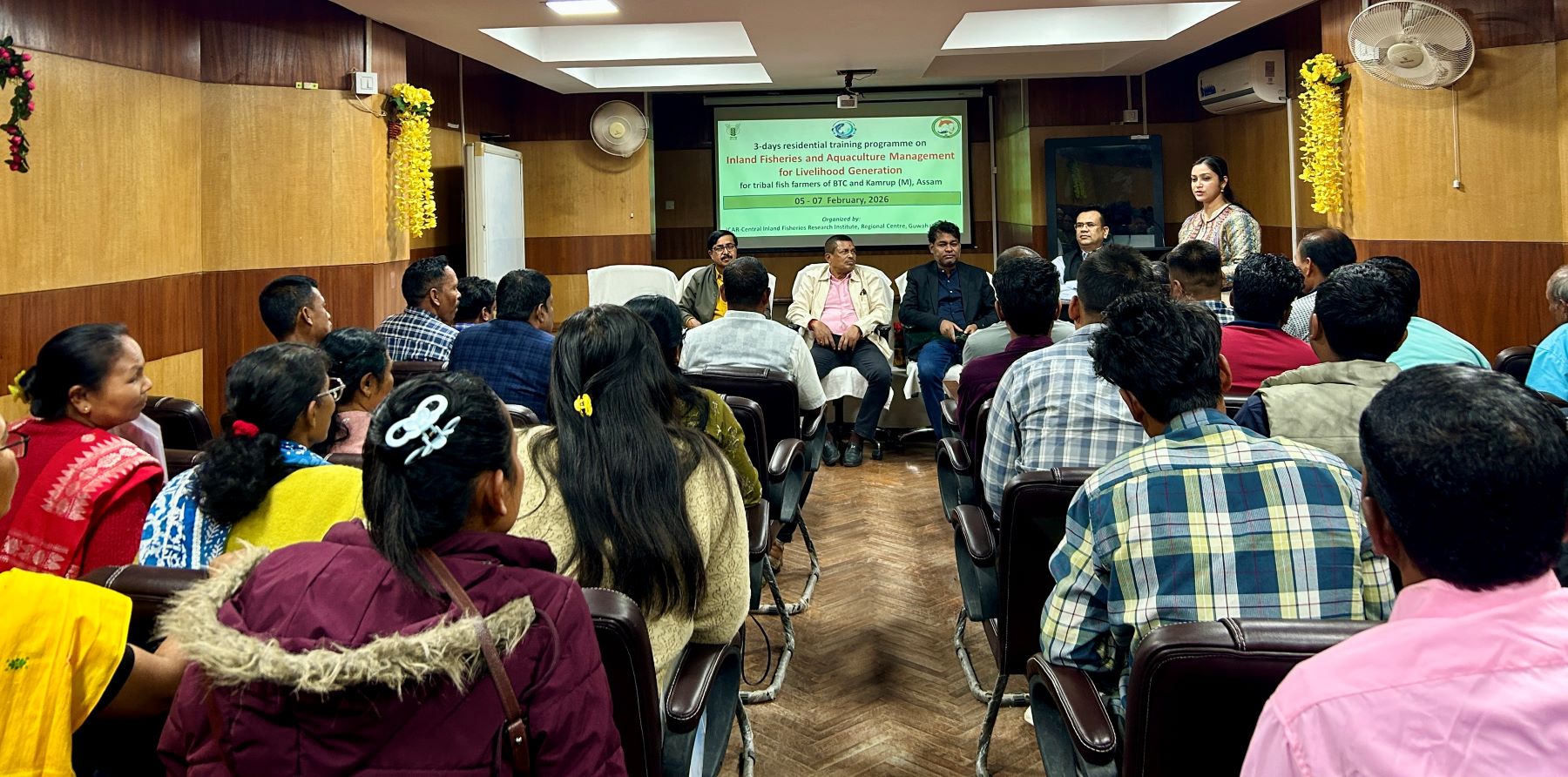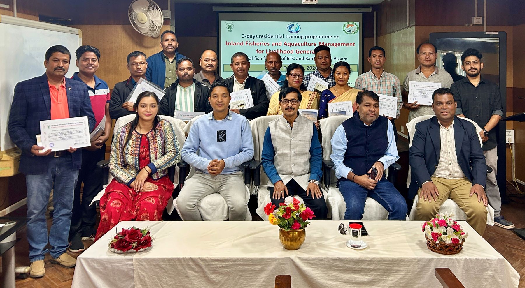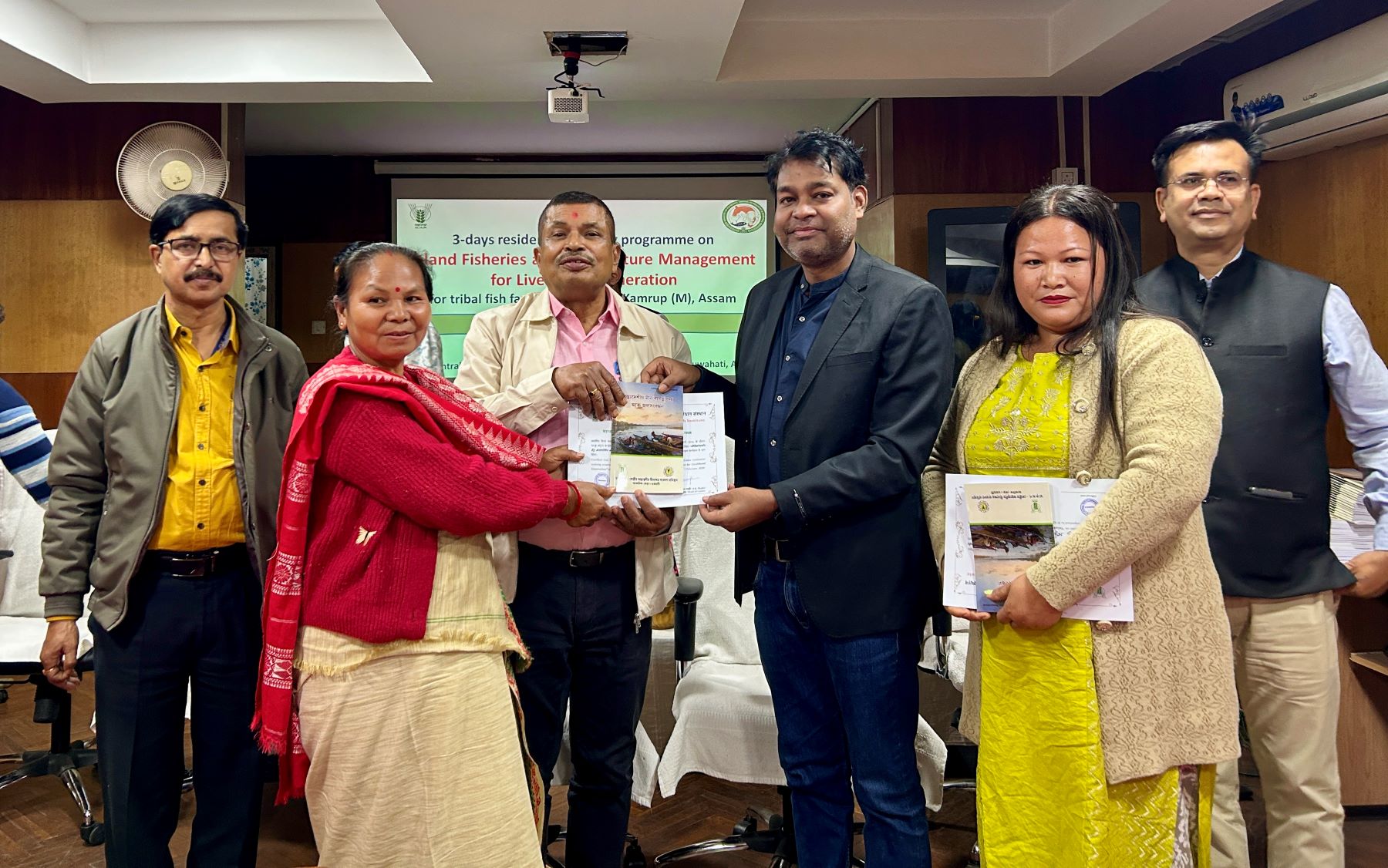 The inaugural session was graced by Shri Hemanta Narzary, IAS (Retd.), Former Principal Secretary, Government of Assam, as the Chief Guest. Addressing the participants, Shri Narzary emphasized the importance of adopting scientific fish farming practices to improve productivity, generate employment, and strengthen rural livelihoods. He urged the fish farmers to actively participate in the training and make the best use of the technical knowledge shared by experts. Welcoming the dignitaries and participants, Dr. S. K. Majhi, Head, ICAR-CIFRI, Guwahati Centre, encouraged the fish farmers to interact with the resource persons and share their practical experiences for mutual learning. Dr. P. K. Hazarika, OSD, Karbi Welfare Autonomous Council (KWAC), Assam, also appealed to the participants to take full advantage of the training programme to enhance their understanding of fisheries management. Dr. B. K. Bhattacharjya, Principal Scientist, in his address encouraged the farmers to adopt fish farming as a sustainable livelihood option and urged them to actively participate in the training sessions with a formal vote of thanks.