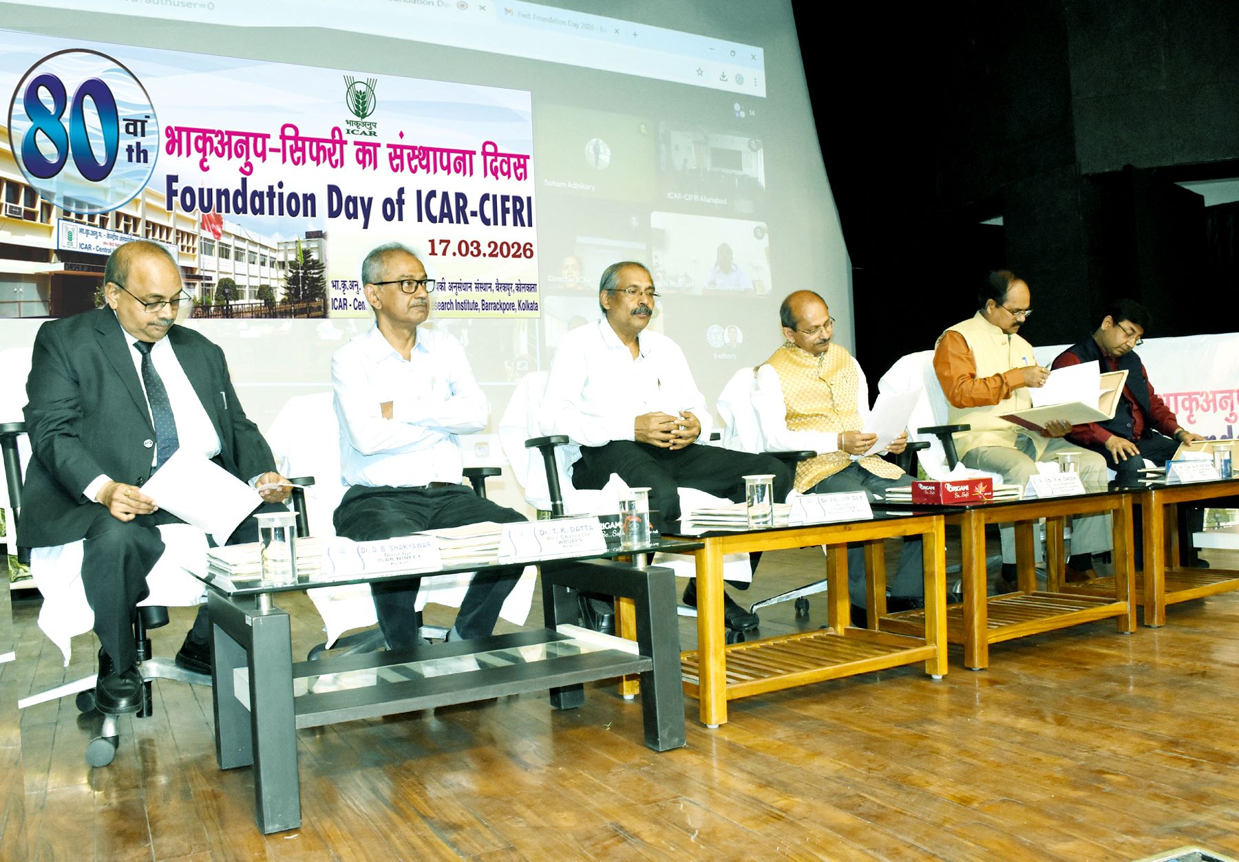 Dr. Prabir Kumar Ghosh, VC , Viswa Bharati University in his address as the Chief Guest, congratulated the officers and staff of ICAR-CIFRI on its 80th Foundation Day, recognizing the institute's pivotal role in shaping the fisheries sector since its inception. He stressed upon that progress of science that can contribute immensely to the growth of nation. Dr. Tirtha Kumar Datta, VC , WBUA & FS praised ICAR-CIFRI for its longstanding support in fostering growth of the fisheries sector in India and applauded its efforts in supporting fishers and farmers to double their incomes, while Dr. Ashok Kumar Patra, VC, BCKV highlighted the Institute's revolutionary technologies like induced breeding and composite fish culture that have transformed the fisheries sector in the country into blue revolution. Dr. Gouranga Kar, Director, ICAR-CRIJAF, conveyed his best wishes to the staff of ICAR-CIFRI, lauding efforts of the Institute in reaching unreached and unserved communities. Dr. D.B. Shakyawar also graced the occasion and commended the Institute’s role in advancing fisheries education and outreach.