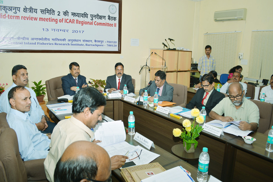 ICAR-CIFRI organized Midterm review meeting of Regional Committee (Region II) on 13th November, 2017 at Barrackpore. The ICAR Region II, comprising the States of Andhra Pradesh, Telangana, Odisha, West Bengal and Union Territory of Andaman & Nicobar Islands and has enormous potentialities for agriculture development including livestock and fisheries. Last Meeting of ICAR Regional Committee – II held at ICAR-NAARM, Hyderabad, 24-25 June 2016 and this meeting was conducted to review the progress of the meeting. Dr. J.K Jena, Deputy Director General (Fisheries) Chaired the meeting. Dr. Jena in his address said while food production scenario of the region has improved substantially over last one decade, the region is still deficit in pulses, oilseeds. Hence, concerted effort of Centre, State, NGOs and other stakeholders are required for a strong Research, Development and Extension Programme in the region to achieve self sufficiency in various sectors of agriculture and also to double the income of the farmers by 2022 in line of the Vision of Govternment of India. A total 26 ICAR-Institutes/RRCs,eight universities participated in the meeting. Representatives from the State Departments of West Bengal, Telangana, Odisha, Andaman and Nicobar Island were also presented in the meeting. The Action taken report was presented by Dr. B.K Das, Director CIFRI and Member secretary of Regional Committee-II. A total of 35 Action points were framed during last RCM-II at Hyderabad. The pregress of the action points and action taken were discussed in thit meeting in detail. Dr. A. Vishnuvardhan Reddy, DirectorIndian institute of Oilseed Research; Dr. D. R. Singh, Director, ICAR-NRC for Orchids;Dr K K Rout, Director PME OUAT; Dr Utpal Kumar Sar, Director Fisheries Andaman; Dr. RN Chatterjee, Director, ICAR-DPR, Hyderabad; Dr. A. Kundu, Director,ICAR-CIARI, Port Blair;Dr. S.K. Ambast, Director,ICAR-IIWM,Bhubaneswar and dignitaries from other institutes and universities participated in the meeting.