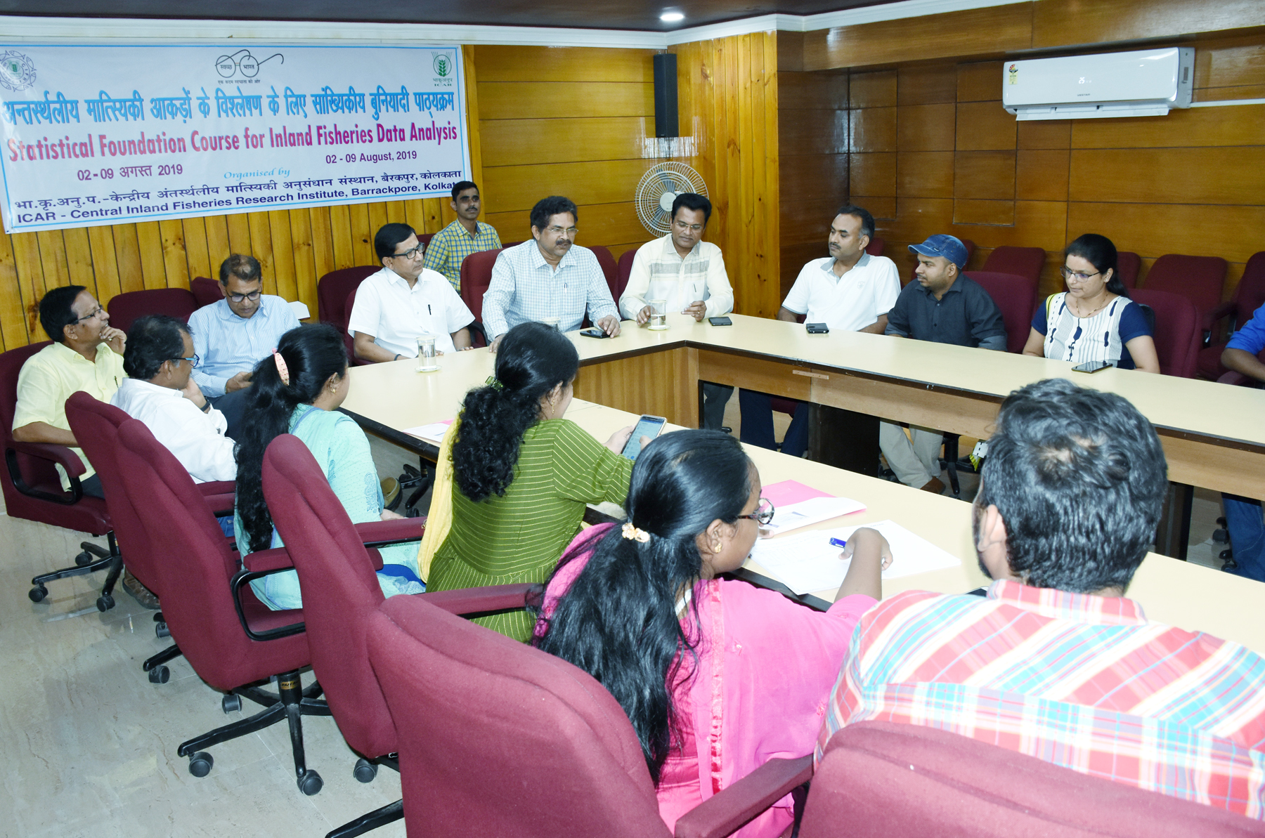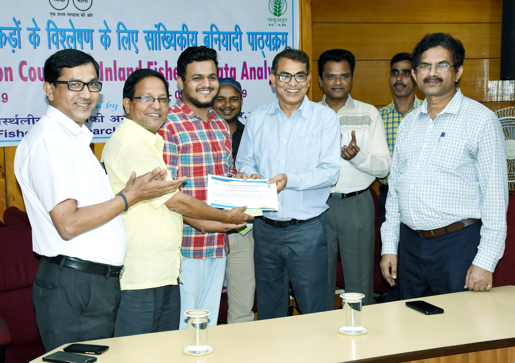 A training program on “Statistical Foundation Course for Inland Fisheries Data analysis” was organized at ICAR-CIFRI, Barrackpore, during 2nd -9th August 2019. A total of 11 participants, including assistant professors, scientists, students and scholars from four different fisheries institutes such as college of fisheries science, Raha, AAU; ICAR- Central Inland Fisheries Research Institute, Barrackpore; College of Fisheries, Dholi, DRPCAU; Vidyasagar University, West Bengal participated in the training programme. At the outset, Dr. R. K. Raman, Scientist cum coordinator of training programme, welcomed all, and Dr. M. Naskar, Principal Scientist cum coordinator of training, enlightened briefly about training to the participants and course structure. The programme was inaugurated by Dr. B. K. Das, Director cum convenor of the training programme and also elaborated the importance of statistics in inland fisheries research and he urged the participants to actively participate and learn the techniques. The aim of this training programme was to update and improve the concept of basic statistical analytical skills for inland fisheries data analysis. The course was structured in two modules with class room lectures followed by practical exercise using statistical software. The lectures of the training programme included utility of statistical tools and associated packages for the inland fisheries management: status and future prospects, nature and concept of data for inland fisheries management, basic concept of sampling in data collection and analysis for inland fisheries data, concept testing of hypothesis and parametric test of significance, analysis of variance (ANOVA) and design of experiments, nonparametric application and approach for handling inland fisheries data, test of significance based on chi-square, concept of simple correlation and regression for fisheries data analysis, introduction to statistical software such as R, SPSS and SAS and its basic operation for data analysis. The valedictory function was organised on 9th August, 2019. On this event all the participants were welcomed by Mr. A. K. Yadav Scientist cum co-coordinator presented brief report about training program including impact of training on the participants. Evaluation of trainees was carried out before and after the training and their feedback was taken for self improvement if any. Maximum participants gave their feedback with a request to conduct more training programme of longer duration. At the end of programme Dr. D. N. Jha, Scientist cum co-coordinator of training, formally offered vote of thanks to all for their participation and their cooperation in successful organisation of training program.