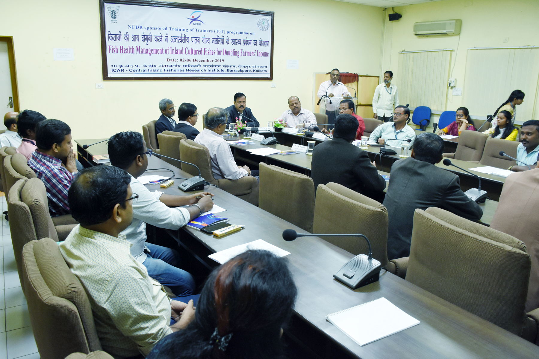 ICAR-Central Inland Fisheries Research Institute (ICAR-CIFRI), Barrackpore, Kolkata-700 120, organized a five day Training of Trainers programme (ToT) from 02nd – 06th December, 2019, sponsored by National Fisheries Development Board (NFDB), Hyderabad on “Fish Health Management of Inland Cultured Fishes for Doubling Farmer’s Income” under the guidance of Dr. B. K. Das, Director, ICAR-CIFRI, Barrackpore and the training programme was coordinated by Dr. B. K. Behera, Principal Scientist, Dr. A. K. Bera, Principal Scientist, Dr. Raju Baitha, Scientist and Ms. M. Shaya Devi, Scientist of ICAR-CIFRI. Total 25 participants from state fisheries department and entrepreneurs of various states attended the programme comprising five from Chhattisgarh, three from Haryana, two each from Madhya Pradesh, Bihar, and Telangana; three entrepreneurs from West Bengal and eight research scholar from ICAR-CIFRI, Barrackpore. The training programme focussed on various aspects of emerging fish and shellfish diseases of inland cultured fishes, conventional and advanced diagnostic approaches including immunological and molecular diagnosis and control and treatment management and role of aquatic environment in fish health management. Feeding management in enclosure culture and eco-health management in reservoir were also included in the course curricula. The more emphasis was given on practical exposure on soil and water chemistry and collection, preservation and dispatch for laboratory diagnosis of fish disease and preventive and curative use of drugs and chemicals along application of better management practices in fish culture. Under the training programme, Dr. T. J. Abraham and Dr. Gadadhar Das of West Bengal University of Animal and Fishery Sciences, Chakgaria, Kolkata delivered on the bacterial, parasitic and fungal diseases and their control and treatment in culture fishes.