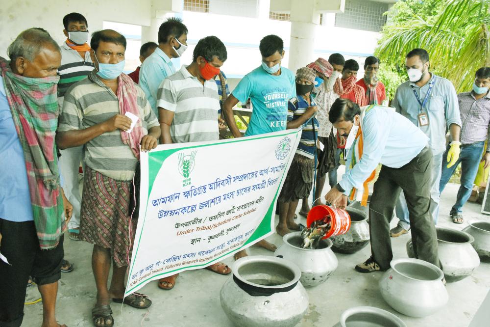 ICAR-CIFRI is working in Sundarban area for up scaling the socio-economic condition of the marginalized community since 2013. During amphan in Sundarban areas there was huge fish mortality and the water quality was deteriorated. In the adopted villages, the Team CIFRI advised the beneficiaries for immediate cleaning of the ponds manually by removing of all the fallen parts of trees from the ponds and removing the bottom organic matter as much as possible. Team also recommended the dose of lime application according to their water areas for restoring the water quality. Due to COVID19 pandemic and lock down situation, technical advisories were given over telephone. To cope up with this fragile state, ICAR-CIFRI also distributed fisheries inputs support to the tribal populace of Gosaba(58) and Sagar Island(105).