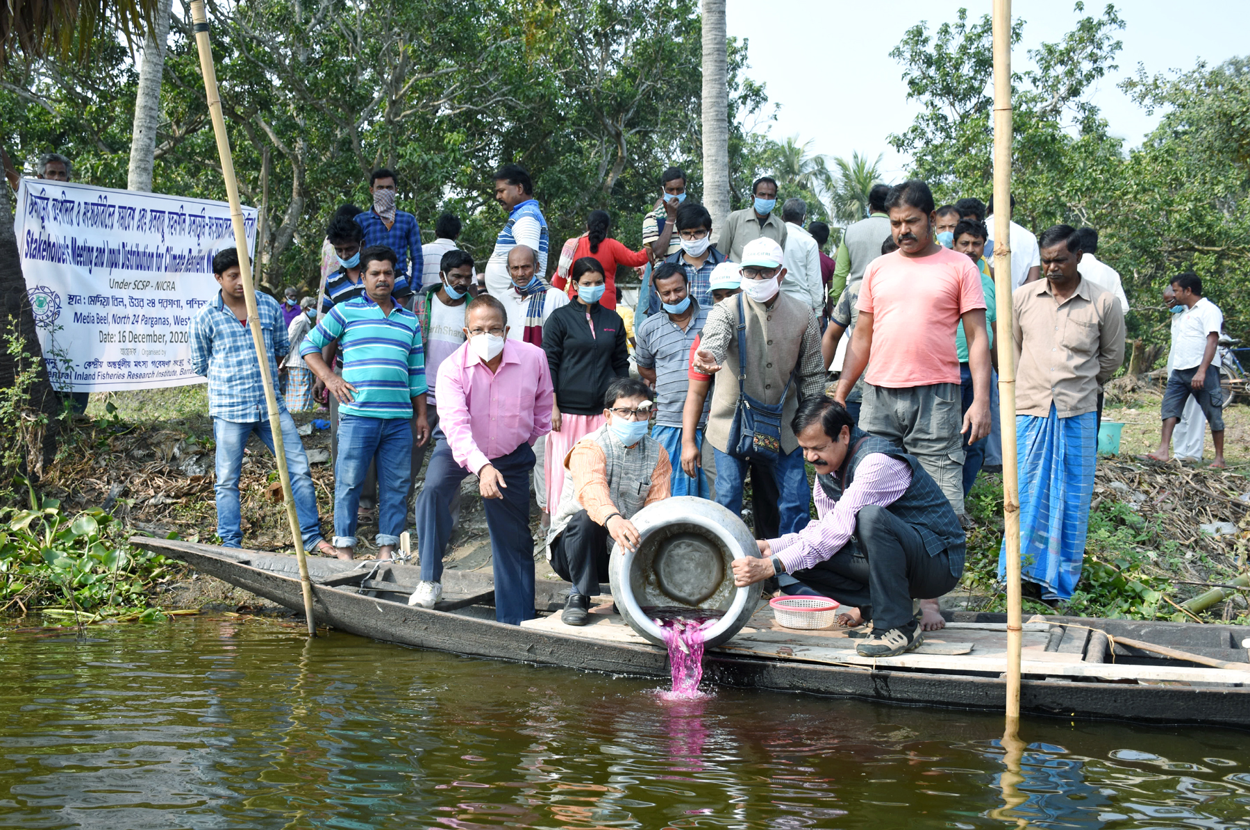 A stakeholder meeting cum awareness program was organized by ICAR-Central Inland Fisheries Research Institute, Barrackpore at Media beel, North 24 Parganas on 16 December, 2020 to create awareness on climate change and its deleterious impacts on wetland fisheries under the project “National Innovations on Climate Resilient Agriculture (NICRA)”. Dr. B. K. Das, Director, ICAR-CIFRI presided over the meeting.The meeting was attended by 100 fishers and project investigators from the Institute. The program was inaugurated with the release of 45000 fish fingerlings of Indian Major Carps, bata (Labeo bata), puti (Puntius sarana) and Tengra (Mystus sp.) by the Director to boost culture based fisheries production from the wetland and conservation of indigenous fishes. He then addressed the fishers and emphasized on the need of conserving the wetlands and discussed various issues faced by the fishers while managing the fisheries of the floodplain wetland. He stated that the Institute is committed to lend technological support to the inland fishers of the country and motivated them to build their capacities on scientific management practices and climate resilient tools for sustainable fisheries. Addressing the gathering Dr. U. K. Sarkar (Head Reservoir and Wetland fisheries Division and Principal Investigator, NICRA) briefed about the programme and explained the various climate smart adaptation strategies. Dr A. K. Das, In charge, Training & Extension cell emphasized on concerted effort of the stakeholders for better management of the resources. The office bearers of co-operative societies and fishers of Media and Panchpota wetlands expressed the difficulties and challenges faced in managing the wetland fisheries in the changing scenario. The program ended with an active interaction session between the fishers and scientific staff of the Institute. The Fisher’s cooperative was also handed over 3 FRP coracles and 2.5tons CIFRI CageGrow feed.