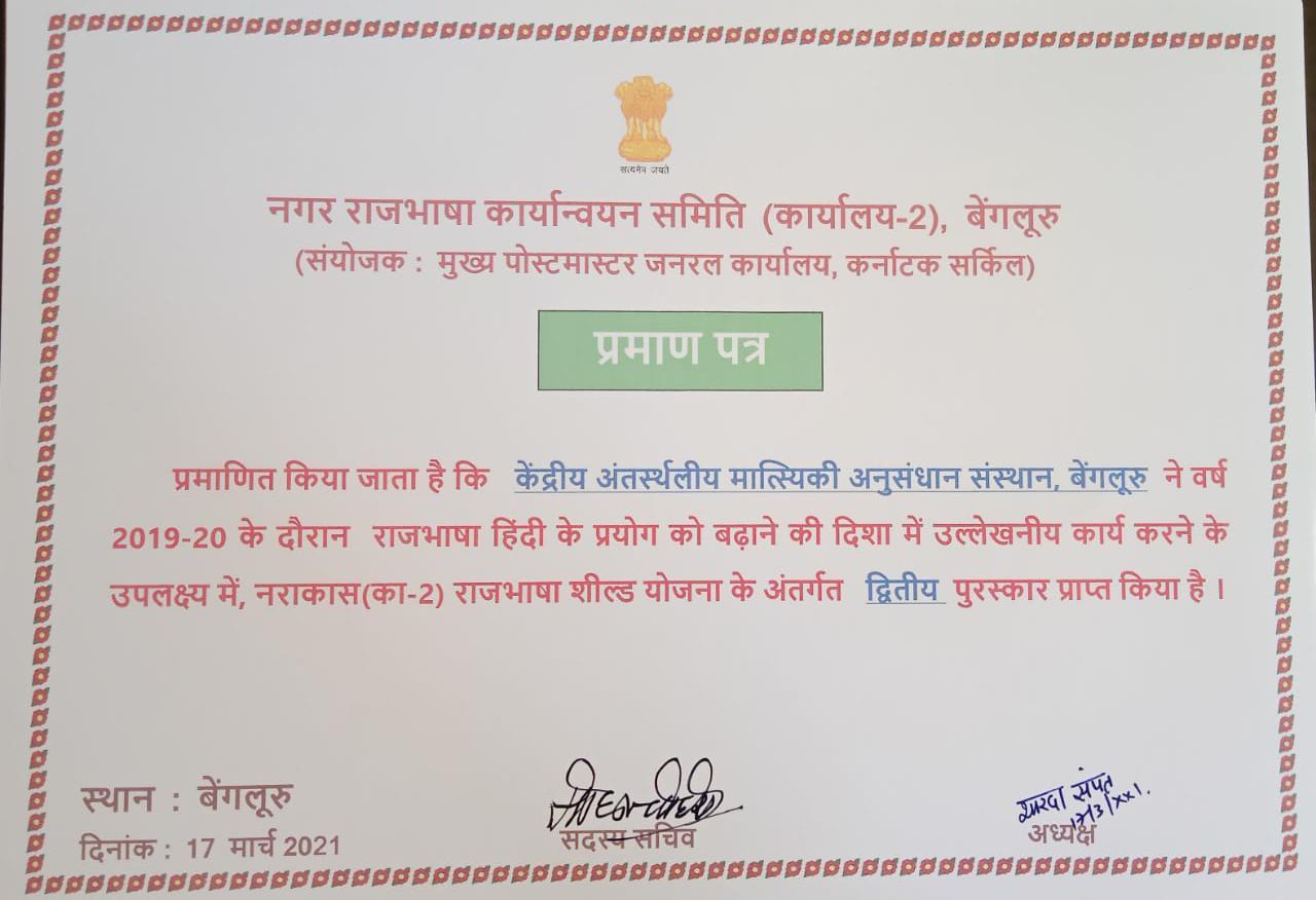 ICAR-CIFRI Regional Centre Bangalore secured second prize for Official language implementation