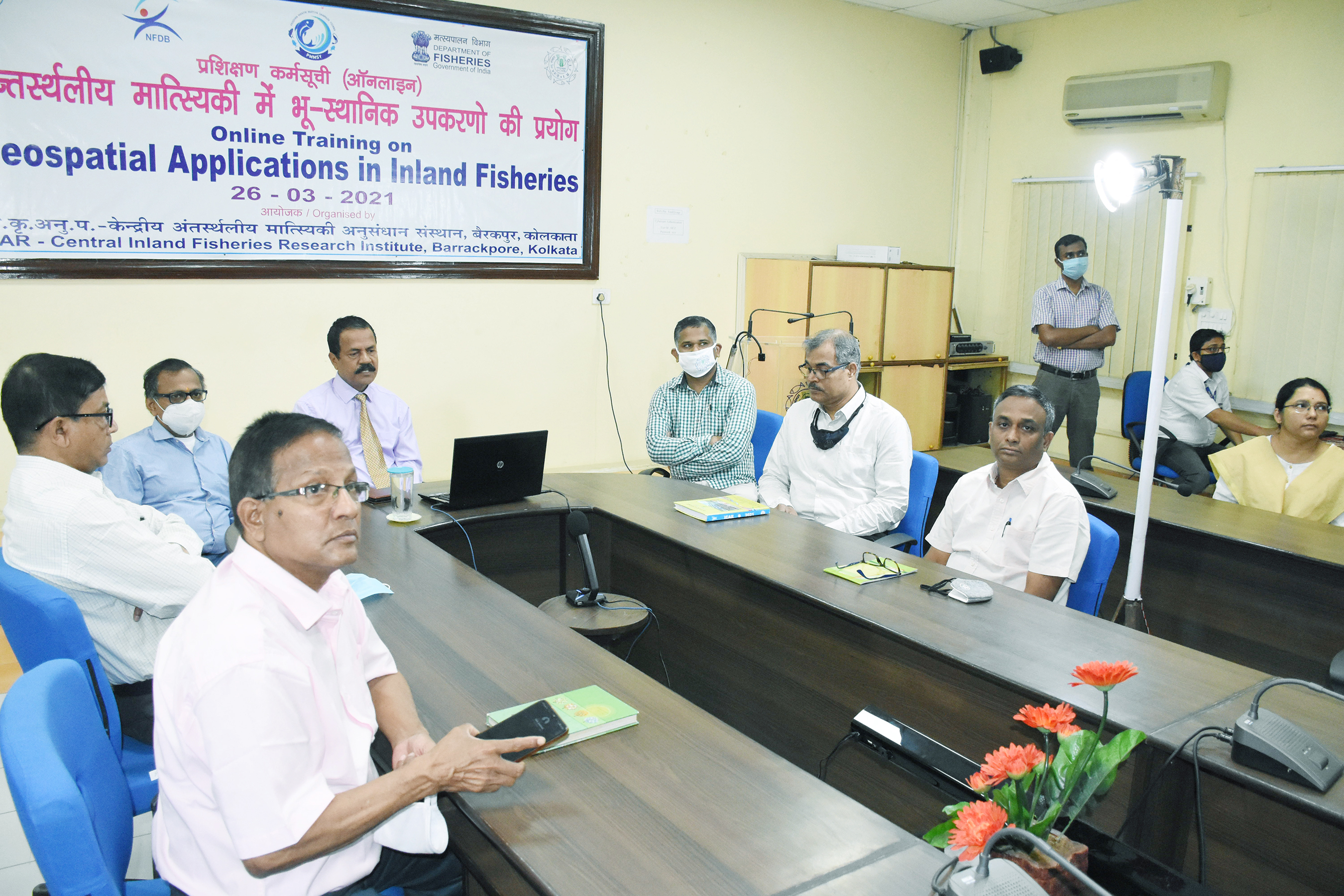 ICAR-CIFRI conducted an online training programme Geospatial Applications in Inland Fisheries on 26th March, 2021 in association with NFDB, PMMSY partnership. The training was conducted under the leadership of Dr. B. K. Das, Director ICAR-CIFRI. Among the august gathering of Head of Division Dr. S. Samanta, HoD, Riverine and Fisheries Division; Dr. U. K. Sarkar, HoD, Reservoir and Wetland Fisheries Division; Dr. B. K. Behera, HoD, Aquatic Environmental Biotechnology & Nanotechnology (AEBN) Division; Dr. S. K. Nag, HoD, Fisheries Resource Assessment & Informatics (FRAI) Division, along with Senior offcials Shri S.K. Sahu and Dr. A. K. Das and Shri Ganesh Chandra from Training & Extension Unit from ICAR-CIFRI (HQ) Barrackpore were present. Several esteemed online participants including Dr. Meera D Ansal, Dean, College of Fisheries, GADVASU; Shri M. Karthikeyan from CIFRI, Regional Centre, Bangalore along with participants from faculties and students of College of Fisheries, OUAT, Odisha; GADVASU, Ludhiana and Kamdhenu University, Chhatisgarh.