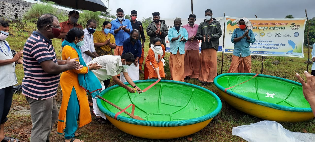 On the occasion of National Fish Farmer’s Day, 10th July 2021, two fishing coracles were distributed to the fishermen of the Vazhani Dam Harijan- Girijan Fisheries Co-operative Society, Vazhani, Thrissur district. The programme was inaugurated by Shri. T. V. Sunil Kumar, President, Thekkumkara Grama Panchayat, Vazhani, Thrissur, Kerala. Other guests included Smt. Shiny Jacob (Ward member, Vazhani), and Shri. P. Gangadharan (President, Vazhani Dam Harijan- Girijan Fisheries Co-operative Society).