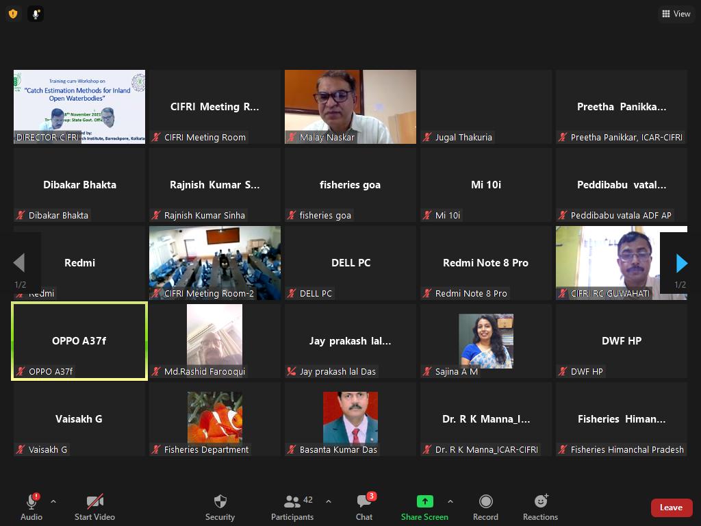 ICAR-CIFRI, Barrackpore conducted a one day virtual training-cum-workshop on “Catch Estimation Methods for Inland Open Waterbodies” on 8th November 2021 for various State Fisheries Dept. officials of India. The programme was aimed to provide the basic understanding of sampling strategies and their implementation for the estimation of fish catch in various inland open waterbodies‚ viz. Reservoir, Wetlands and River etc. Dr. Basant Kumar Das, Director, ICAR-CIFRI, Barrackpore, welcomed all the participants and briefed about the fish catch scenarios of the country and objectives of the programme.