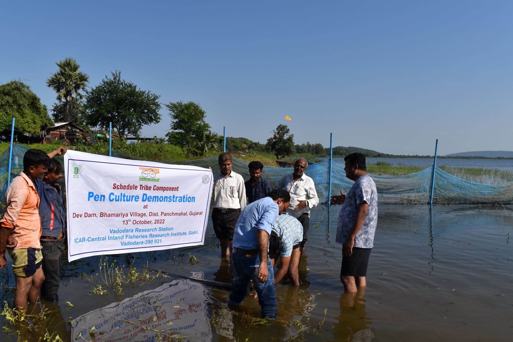 Availability of stockable size fish fingerlings is one of the bottlenecks in increasing fish production from reservoirs in India. ‘CIFRI HDPE Pen’ is a technology developed by ICAR-Central Inland Fisheries Research Institute to provide opportunity to the fishermen to raise the stockable size fish fingerlings at reservoir site by enclosing part of the reservoir. This technology has been successfully used in states of Bihar, West Bengal, Odisha, Assam, Uttar Pradesh etc., in wetlands and reservoirs. In view of increasing fish production from reservoirs of Gujarat, Vadodara Research Station of ICAR-CIFRI is demonstrating this technology in the state under the Schedule Tribe Component (STC) of Central Government.