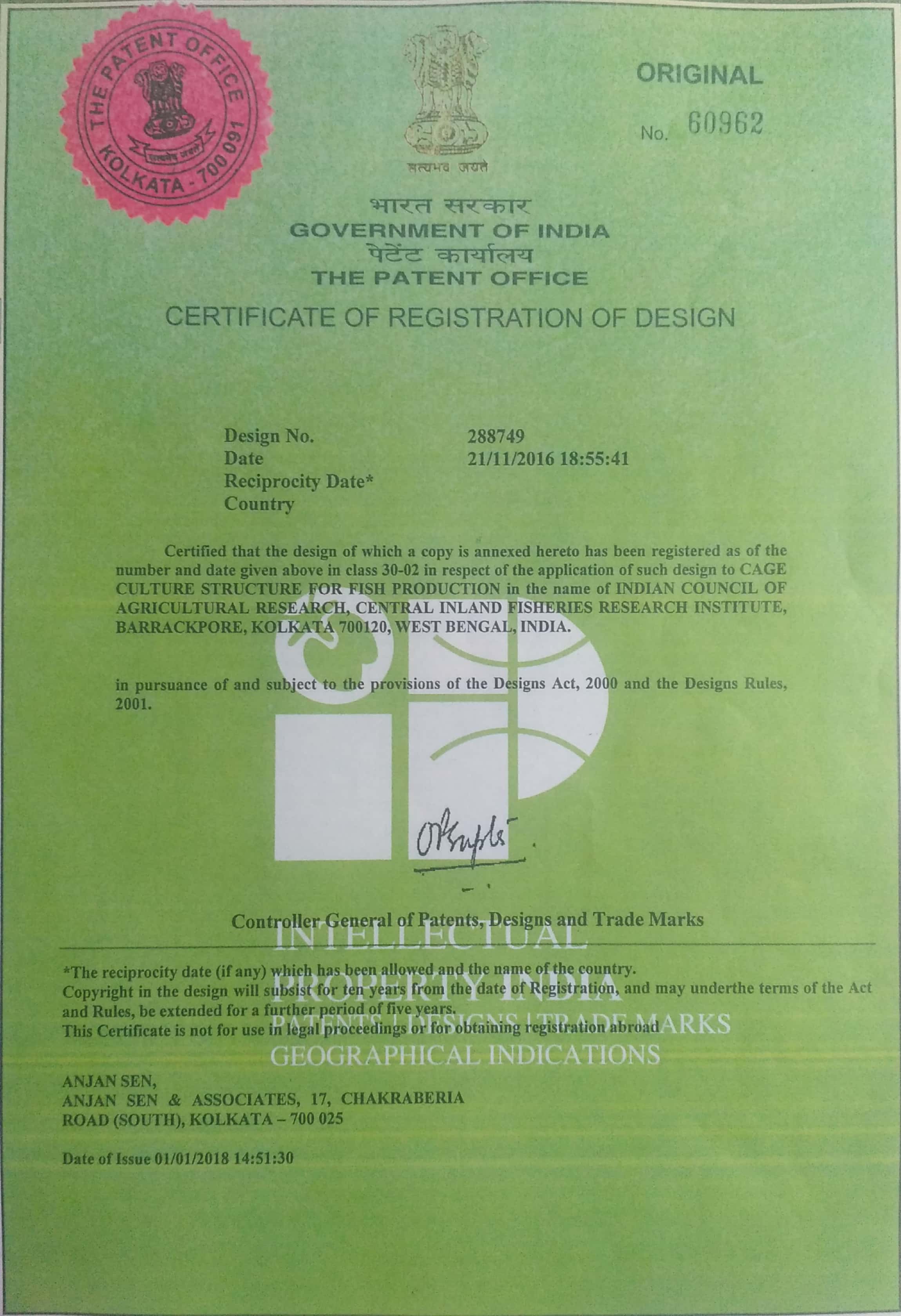ICAR-Central Inland Fisheries has received Original Certificate of Registration of Design for