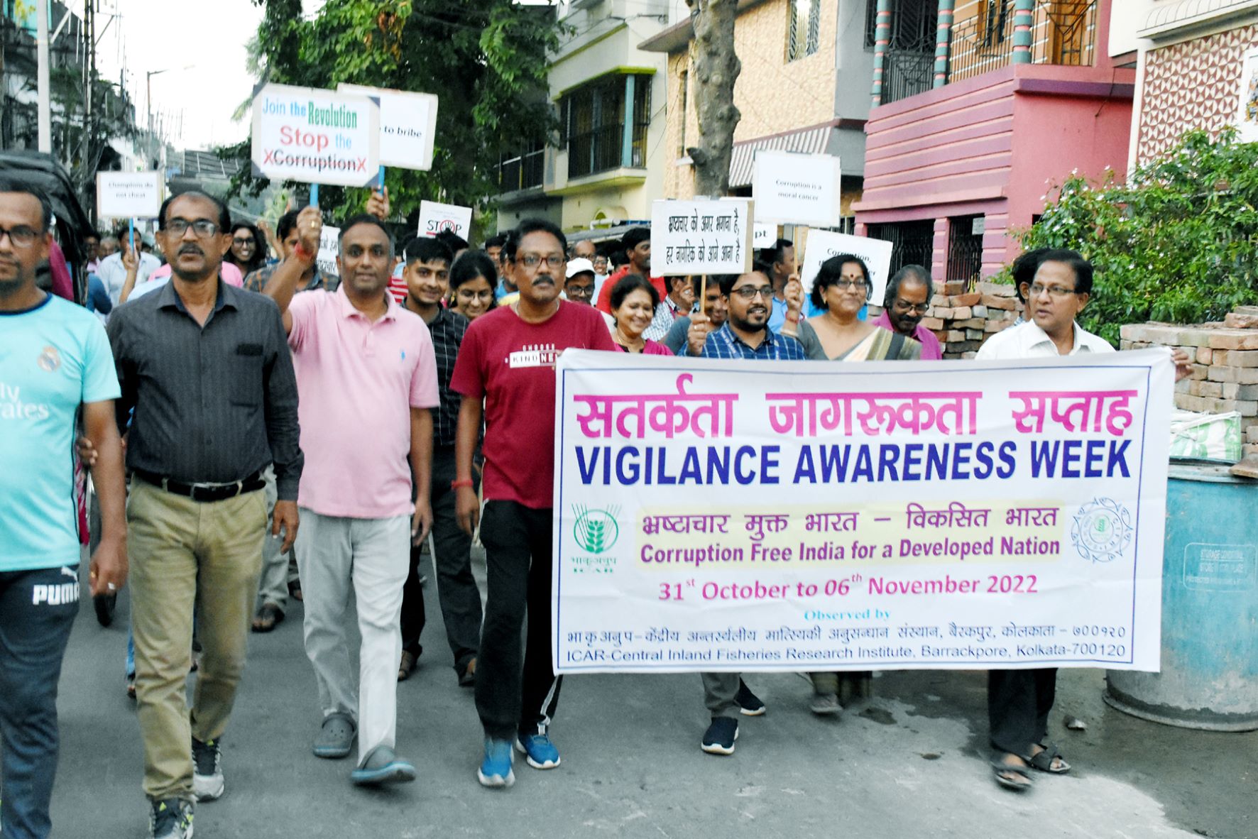 The week long observance was started with administration of pledge to the officials and staff on 31st October by the Director. Many of the staff also took e-pledge. Large numbers of posters, banners, placards were displayed at the campus premises showing the ill effects of corruption and the commitment of CIFRI toward zero tolerance on corruption. On the next day all the staff formed a human chain showing the solidarity and unity in fighting the corruption. The human chain was followed by a walkathon upto local ferry ghat, a busy commuting point, in order to make aware and sensitize the general public for raising their voice against cheating/corruption. The walkathon arouse much interest of the locals and commuters.