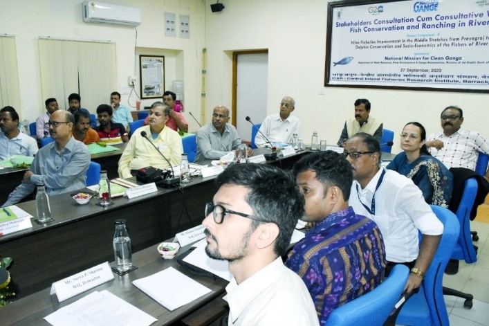 Dr. B. K. Das, Director, ICAR-CIFRI outlined the workshop with a brief presentation of the work carried out under NMCG Hilsa Project (Component II) for last 3 years. In the presentation, he highlighted the project's objectives, significant activities and achievements under the project. Dr. Das explained that more than 90,000 of adult Hilsa were ranched at the upstream of Farakka barrage with an aim to enhance the Hilsa stock in the middle stretch of the river Ganga. He briefed about the hilsa ranching procedure, tagging methods employed and the recovery of Hilsa in the upstream. Besides Hilsa egg and spawn were also ranched into the river for increasing the juvenile availability and the impact of ranching on hilsa population was also presented. Dr. B.K. Das also presented the pilot-scale experiments conducted under the project for captive breeding and rearing of Hilsa. Issues and challenges related to the restoration and conservation of Hilsa in river Ganga and their captive rearing was also addressed.