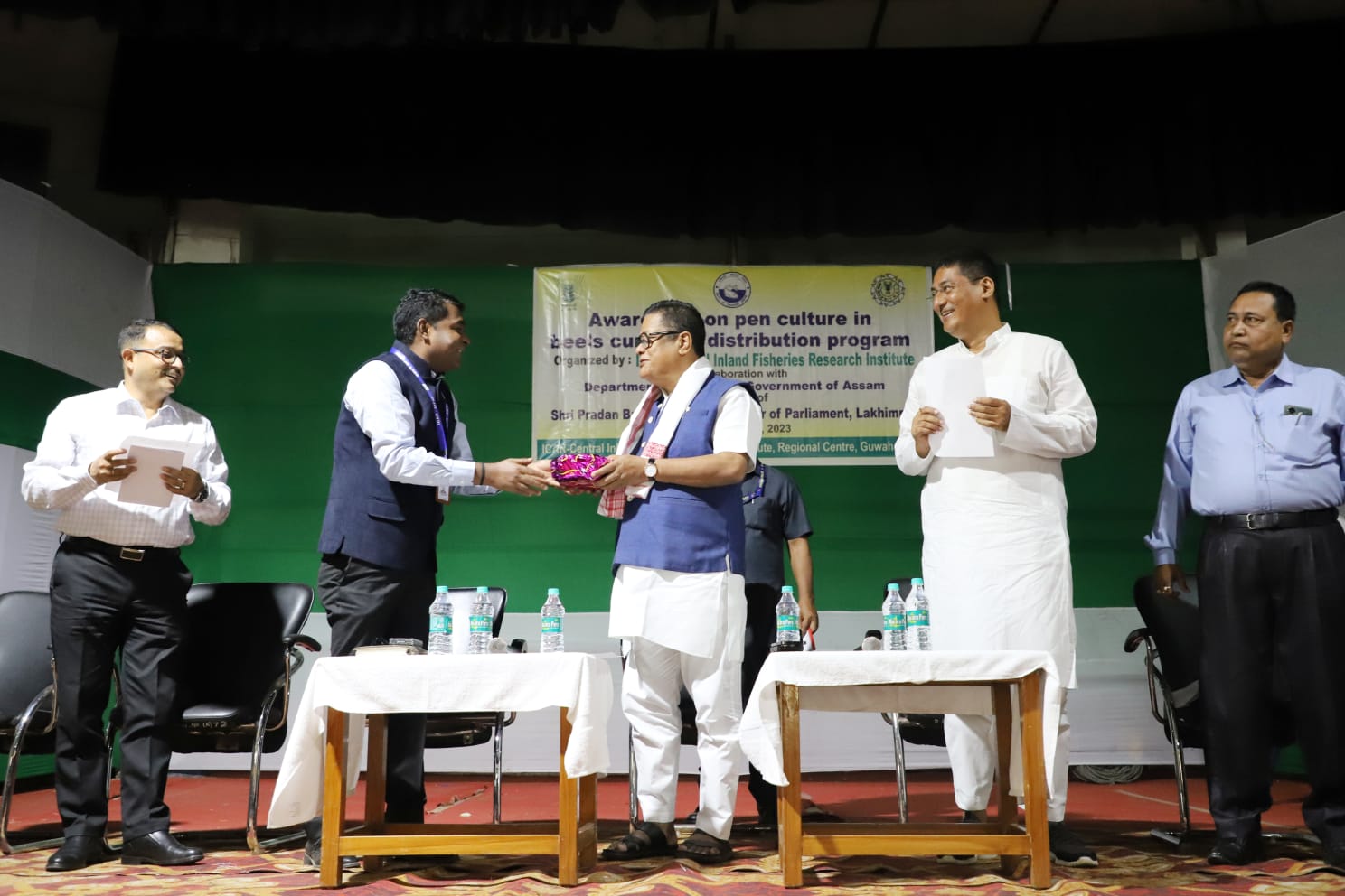 ICAR-Central Inland Fisheries Research Institute organized an “Awareness on pen culture in beels cum feed distribution program” under the guidance and leadership of Dr. B.K. Das, Director, ICAR-CIFRI, Barrackpore and Dr. S.K. Majhi, Head, ICAR-CIFRI Regional Centre, Guwahati on 16th October, 2023 at Dhemaji, Assam.