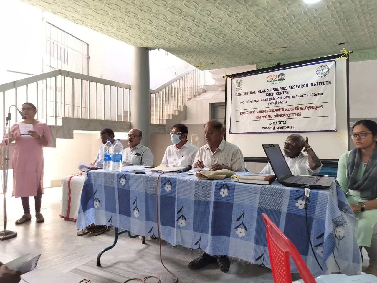 ICAR-CIFRI Kochi Centre organised a mass awareness programme and stakeholders’ meeting on 15th February 2024 in Edakochi, to address the issue of weed infestation (Eichhornia crassipes) in the Vembanad lake and evaluate its impact on the fishing activities and livelihood of fishermen. A total of 100 fishermen from Aroor, Perumbadappu, Arookutty and Edakochi panchayats of Alappuzha and Ernakulam districts participated in the meeting. The meeting started with a welcome speech by Dr. Deepa Sudheesan, Senior Scientist and Incharge, Kochi centre of ICAR-CIFRI. She welcomed the dignitaries and participants and gave an overview of the institute activities. Mr. A. R. Sivaji, Chairman of the Vembanad Kayal Samrakshana Samithi, delivered the presidential address with remarks on the growth and proliferation of water hyacinth and associated issues in the Vembanad lake. Mr. V. D. Thilakan, General Convener of the Vembanad Kayal Samrakshana Samithi, expressed his concerns of the degrading health status of Vembanad lake. Mr. Joseph Xavier Kalappurackal, General Secretary of the All Kerala Fishing Boat Operators Association, stressed on the need of reduction of water hyacinth from the source itself for the complete removal of this weed from the aquatic ecosystem. Mr. V. Padamanabhan, Mr. Amminikkuttan, and Mr. Chandrabose commented on the need of sustainable conservation of Vembanad lake.