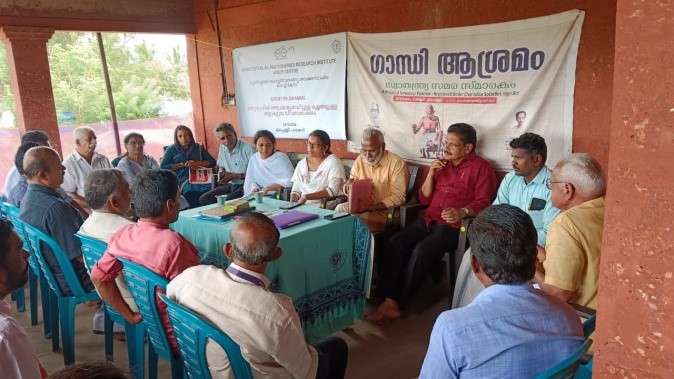 A stakeholder meeting was held at the Gandhi Ashram, Elappully village, Palakkad. The group discussion was led by Shri. Pudussery Srinivasan, Director of Sarvodayakendram. Dr. N. Shudhodanan, Patron of the Gandhi Ashram Working Group, Dr. Peethamabaran, Dr. Suresh Babu, and Mr. Jose Mathews, members of the Farm Care Foundation, and Shri. Girish Babu K., Elappully Grama Panchayat Member, shared their views. The meeting highlighted the need for the utilization of unused ponds and renovation of neglected ponds for fish culture interventions, emphasized the importance of the availability of good quality fish seeds and cost-effective feed, and discussed the possibilities for developing a fish hatchery, fish feed unit, and an ornamental fisheries program. They also requested training on fish farming and personnel training in water quality testing. In addition, they highlighted the need for women empowerment programs like marketing, producing auxiliary fish products, etc., and the necessity to improve the livelihood of the villagers in these areas. The tourism opportunities in these water bodies were also discussed.