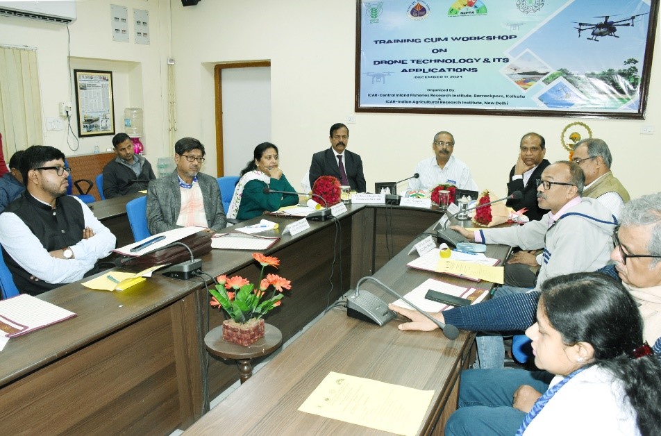 ICAR–CIFRI organized a one-day training cum workshop on “Drone Technology and its Applications” on 11th December, 2024 at ICAR-CIFRI, Barrackpore, Kolkata. Addressing the critical needs of the inland fisheries sector, this was the first-ever initiative focusing on the potentials of drone technology in inland fisheries management. The workshop highlighted on India’s agricultural sector which embraces modern technology agriculture drone which has emerged as a game-changing tool for agriculture sector. These unmanned aerial vehicles (UAVs) offer a range of applications, from monitoring and precision spraying to data analysis, empowering Indian farmers with valuable insights for efficient and sustainable farming.