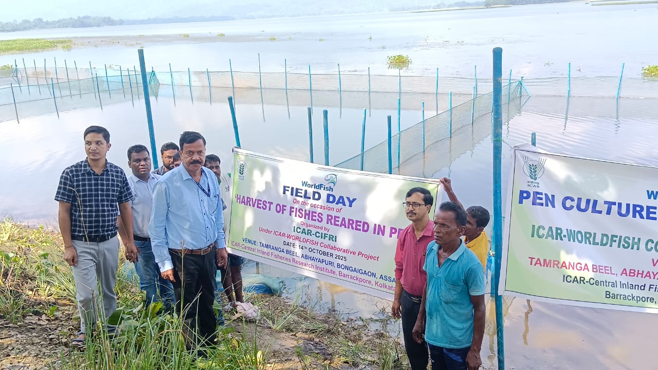On the occasion of successful harvest of fishes reared in pens, a Field Day on “Harvest of fishes reared in Pens” and an awareness program on 'Pen culture in beels for livelihood' was organized on 14.10.2025 at Tamranga beel. The programme was organized under the overall guidance of Dr. B. K. Das, Director, ICAR-CIFRI, Barrackpore; Dr. S. K. Majhi, Head and Dr. B. K. Bhattacharjya, Principal Scientist, ICAR-CIFRI RC, Guwahati. It was coordinated by Dr. Pronob Das, Senior Scientist; Dr. S. Borah, Scientist and Mr. M. Hoque, YP-II, ICAR-CIFRI RC, Guwahati. Shri Harun Rashid Mondal, Sub-Divisional Fishery Officer, Abhyapuri, Bongaigaon district, Govt. of Assam graced the Programme. Mr. P. Kalita, Fishery Development Officer of the district also joined the programme. The programme was attended by 60 people including beel lessee, fish farmers, officials, and Scientists.