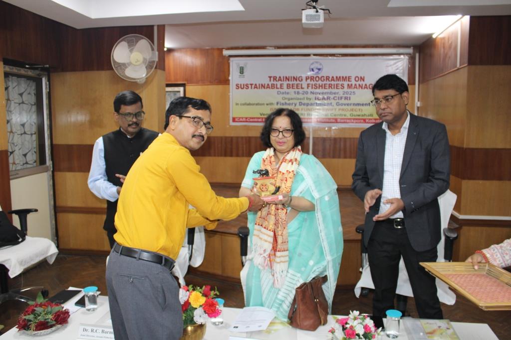 During the 3-days training programme, emphasis was given on sound and holistic management of beel fisheries. Important topics like management protocols for beel fisheries, macrophyte control, fish disease management, environment monitoring, fish seed rearing, community based fisheries management, engineering aspects, fish in human nutrition were covered. The valedictory session of the training programme was held on 20th November, 2025. In the valedictory session Dr. Simanku Borah, Scientist and Coordinator of the training program presented a brief training report. Shri Gauri Sankar Das, ACS, Director of Fisheries, Assam was the chief guest in the valedictory session. He emphasized that there is scope for tremendous development in fisheries sector of the state and particularly in beel fisheries and all the officials should work cohesively and whole-heartedly. Fisheries officials of the state expressed their satisfaction on the training program.