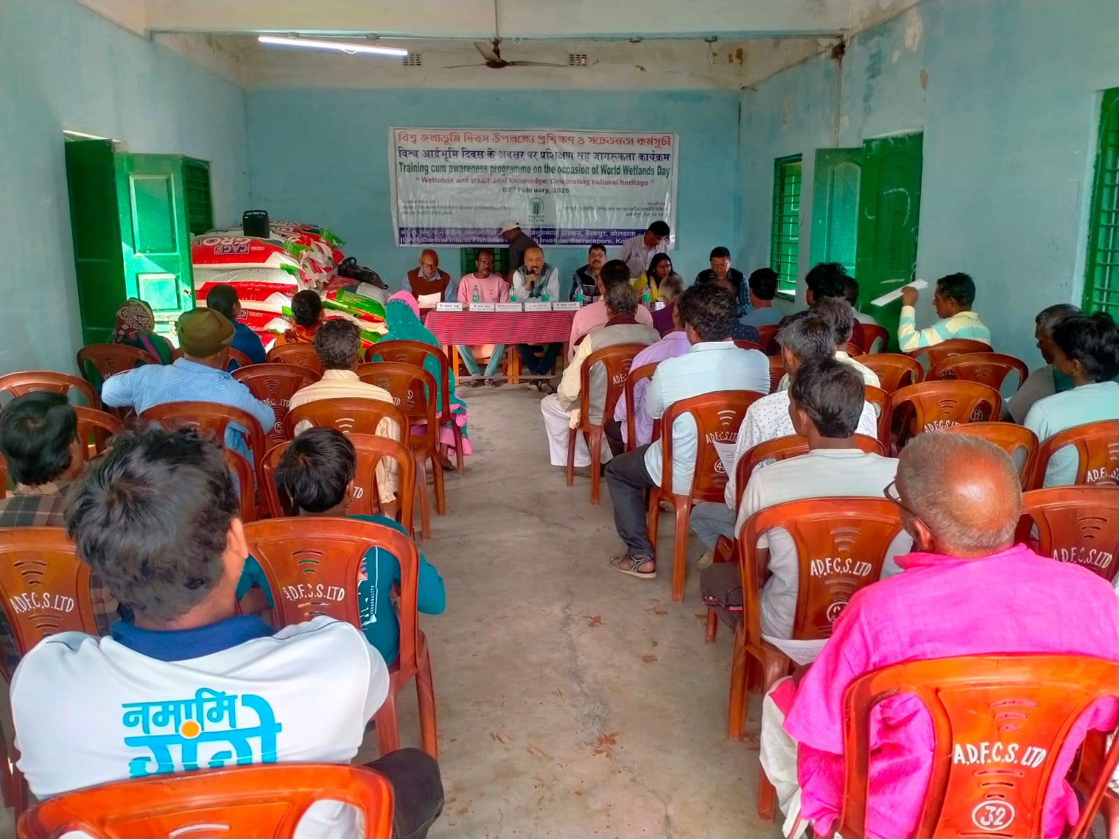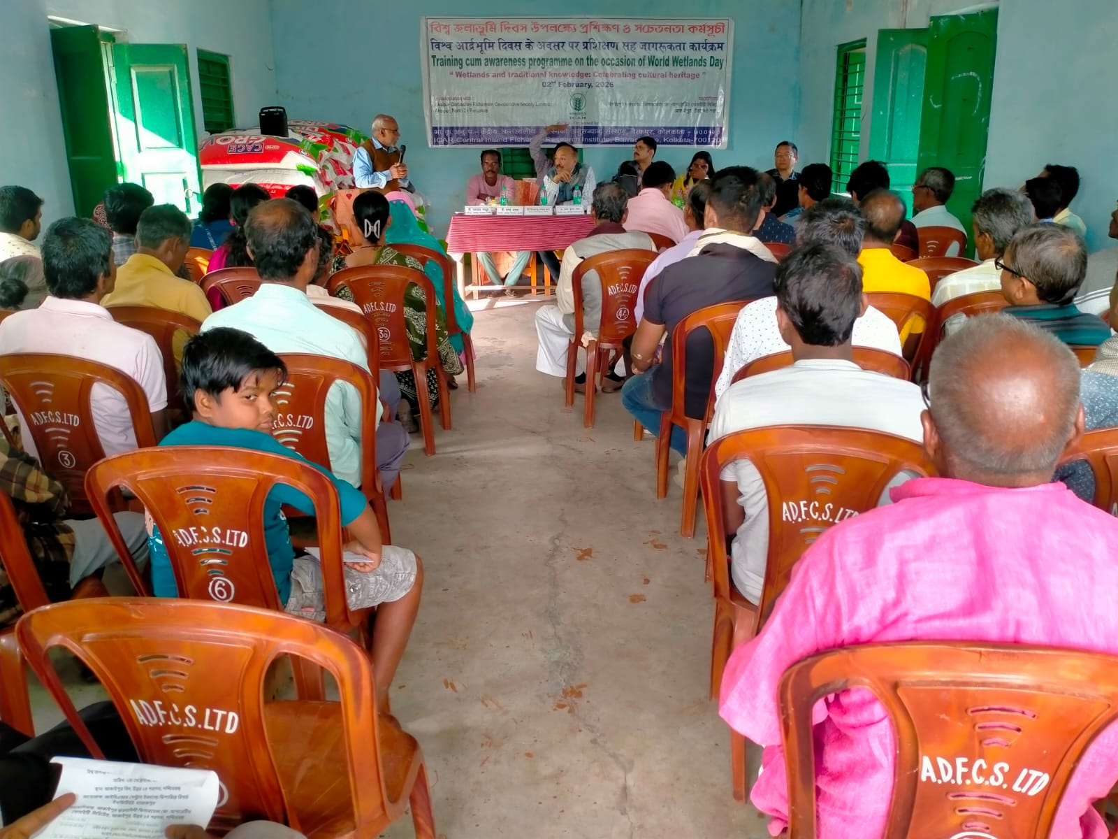 It is essential to put an effort to restore and conserve this vital ecosystem with participation of the stakeholders at ground level like fishers associated with the wetland. ICAR-Central Inland Fisheries Resources Institute conducted a training cum awareness programme with the theme of the year 2026 i.e. “Wetlands and Traditional Knowledge: Celebrating Cultural Heritage.” on the occasion of the World Wetland Day 2026 celebration on 2nd February 2026 at Akaipur beel, Nadia, West Bengal to extend training on sustainable management of wetland fisheries and sensitize the fishing community about conservation of wetland. The programme was held in association with the Akaipur Dwarbashini Fishermen’s Co-operative Society Limited, Akaipur, North 24 Parganas, West Bengal. During the programme, Dr. Ranjan K. Manna, Principal Scientist and Head, Reservoir and Wetland Division, ICAR-CIFRI, described different activities of ICAR-CIFRI in wetlands under the leadership of the director, Dr. Basanta K. Das. He also highlighted the importance and role of all different trophic levels of wetlands for different ecosystem services and emphasized the needs of important factors like river connectivity, aquatic macrophytes, etc for the conservation of precious biodiversity of wetlands and urged the fishers to actively participate for the conservation and restoration of wetland to ensure the long-term sustainability of fish production. Dr. Asit Kumar Bera, Principal Scientist discussed about different dimensions of recurrent fish disease associated mortality in wetlands including possible preventive measures. Mr. Sanatan Parui, Chairman, and Mr. Swapan Malo, Secretary of the Akaipur Dwarbashini Fishermen’s Co-operative Society Limited, discussed various issues and challenges especially anthropogenic pollution they face for managing wetland fisheries.