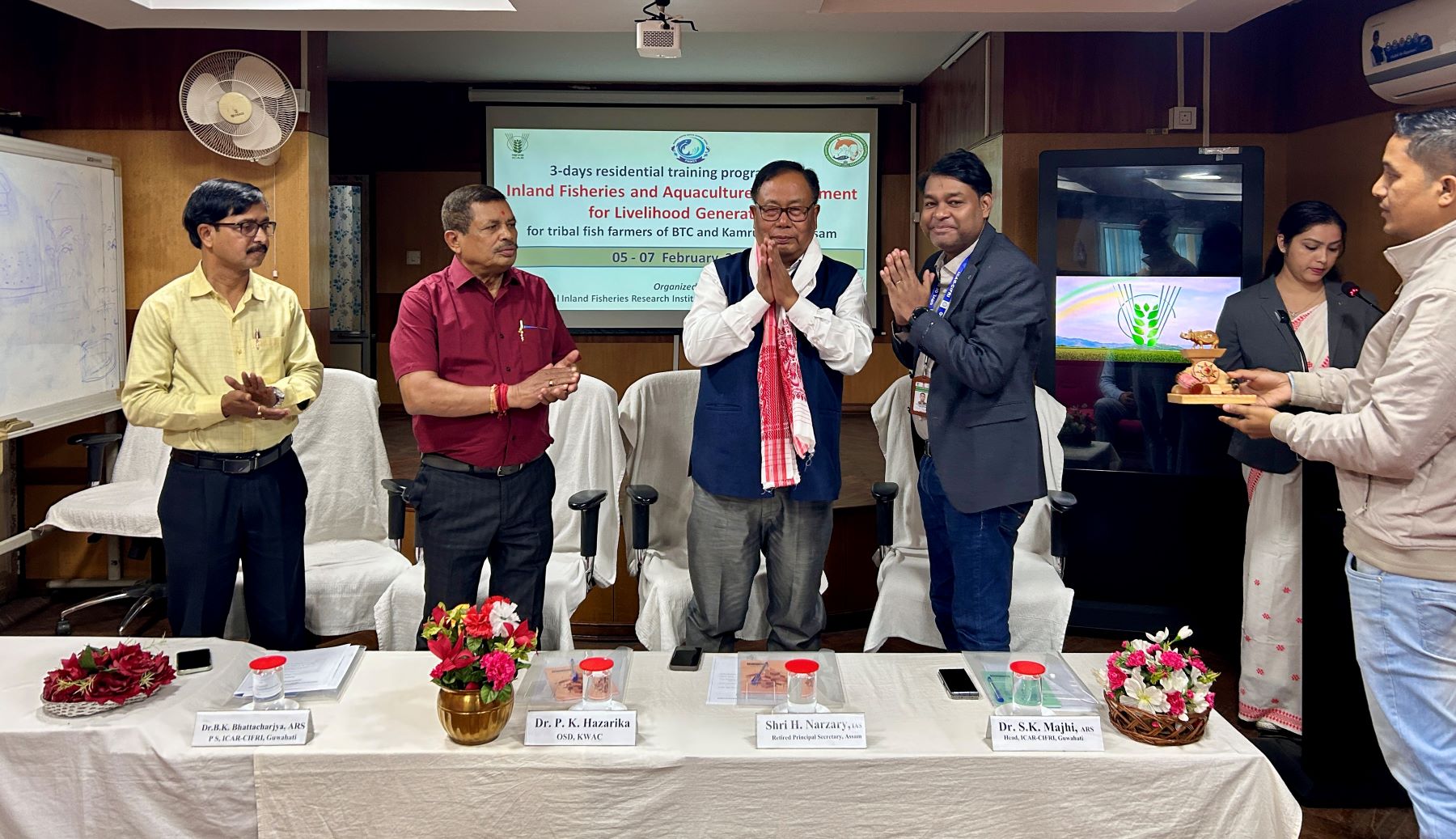 The inaugural session was graced by Shri Hemanta Narzary, IAS (Retd.), Former Principal Secretary, Government of Assam, as the Chief Guest. Addressing the participants, Shri Narzary emphasized the importance of adopting scientific fish farming practices to improve productivity, generate employment, and strengthen rural livelihoods. He urged the fish farmers to actively participate in the training and make the best use of the technical knowledge shared by experts. Welcoming the dignitaries and participants, Dr. S. K. Majhi, Head, ICAR-CIFRI, Guwahati Centre, encouraged the fish farmers to interact with the resource persons and share their practical experiences for mutual learning. Dr. P. K. Hazarika, OSD, Karbi Welfare Autonomous Council (KWAC), Assam, also appealed to the participants to take full advantage of the training programme to enhance their understanding of fisheries management. Dr. B. K. Bhattacharjya, Principal Scientist, in his address encouraged the farmers to adopt fish farming as a sustainable livelihood option and urged them to actively participate in the training sessions with a formal vote of thanks.