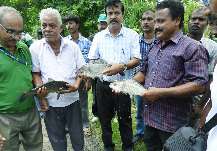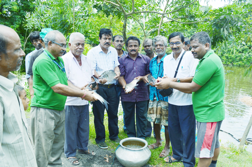 Prior to Harvest mela, a demonstration of water quality parameter was conducted by Mr. Subhendu Mandal and he also advised the farmers the importance of maintaining good water quality. Dr. Sanjay Bhowmick explained about the common fish diseases and their prevention. He also demonstrated how fish behavior will change in case of a diseased organism. Mr. C. N. Mukherjee, conveyed the importance of integrated farming and utilization of the dyke area for organically vegetable cultivation along with the kitchen garden.